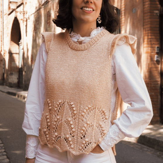 Il gilet è lavorato avanti e indietro dal basso verso l'alto. Lavorerai prima il dietro e poi il davanti. Cucirai il davanti e il dietro del gilet su ciascuna spalla con la tecnica dell'innesto. Poi riprenderai e lavorerai i bordi a coste sullo scollo e la balza sulla parte superiore di ciascuna spalla.