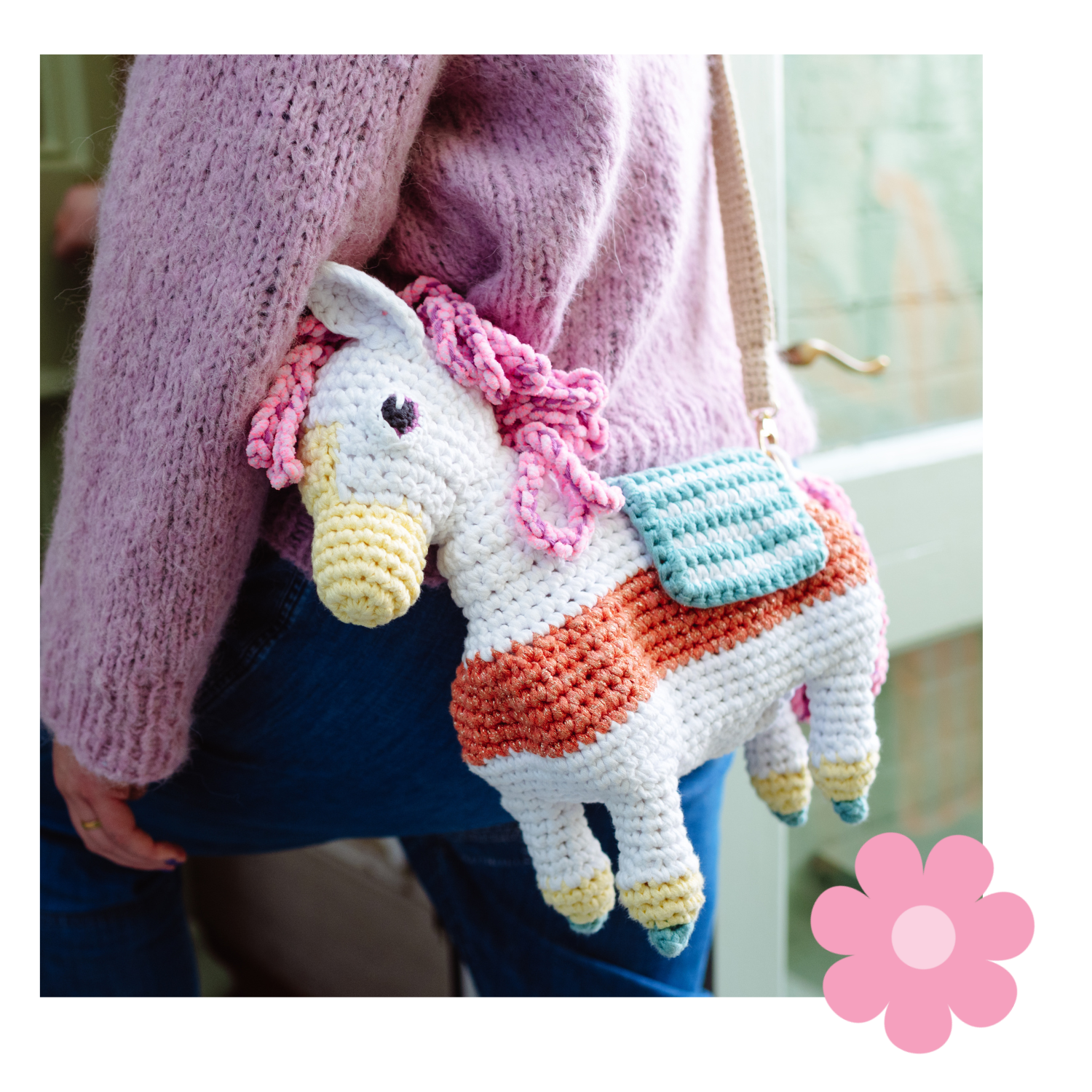 La coda del cavallo è in realtà una nappa removibile che si aggancia alla tracolla della borsa, aggiungendo movimento e personalità.