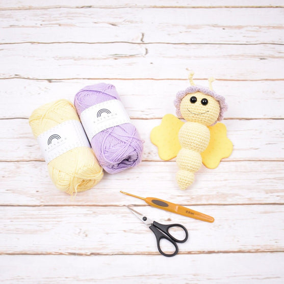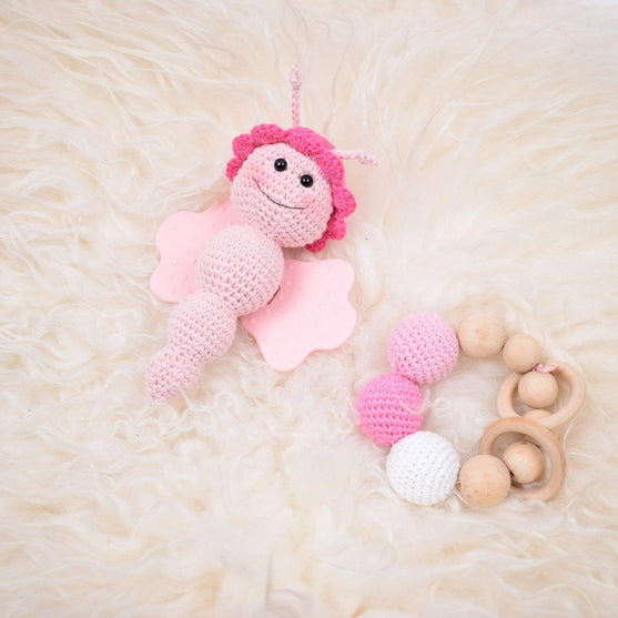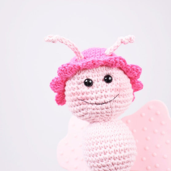 Dolce farfalla sensoriale per i più piccoli. La farfalla ha per ali due formine massaggiagengive e un sonaglietto che suona quando viene mossa.