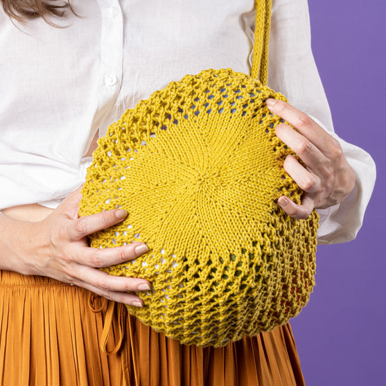 Lavora questa rete a maglia rasata, partendo dall’interno, utilizzando la tecnica del cerchio magico (magic loop), e rifinisci i bordi e le maniglie con un cordoncino realizzato con la tecnica i-cord.
