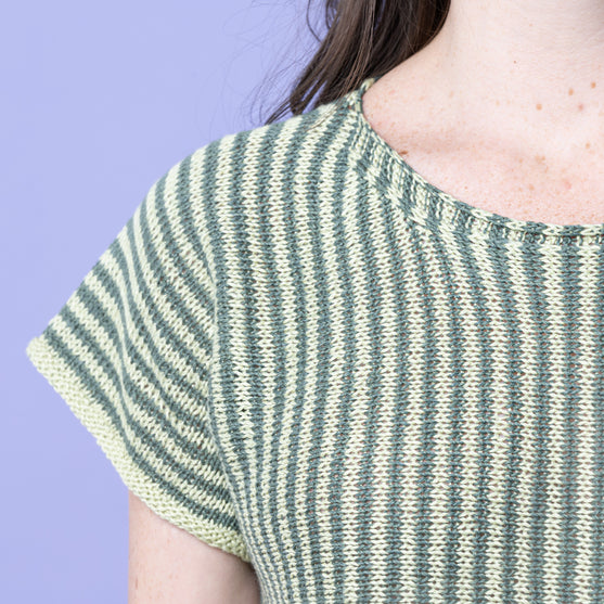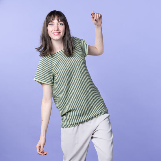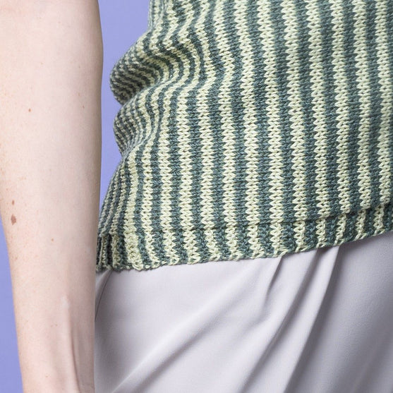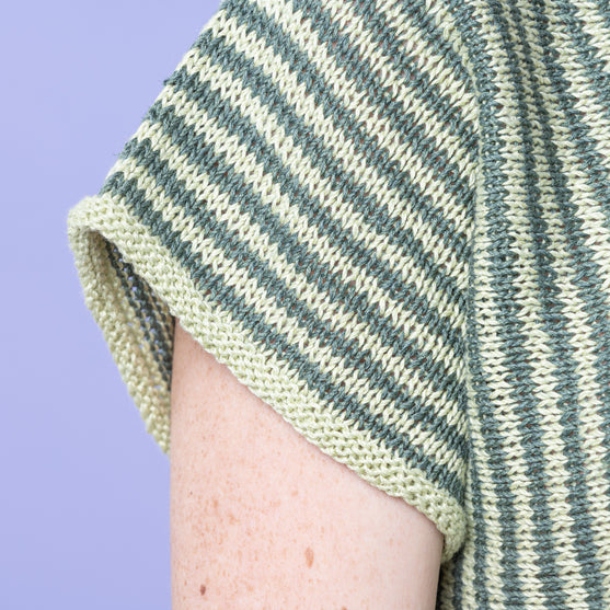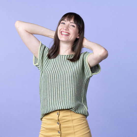 La maglietta Lynn, con le bellissime strisce fini, è lavorata a maglia usando un filato favoloso e leggerissimo, composto da un misto di bamboo, lino e cotone, ragione per cui è assolutamente perfetta per l’estate.