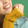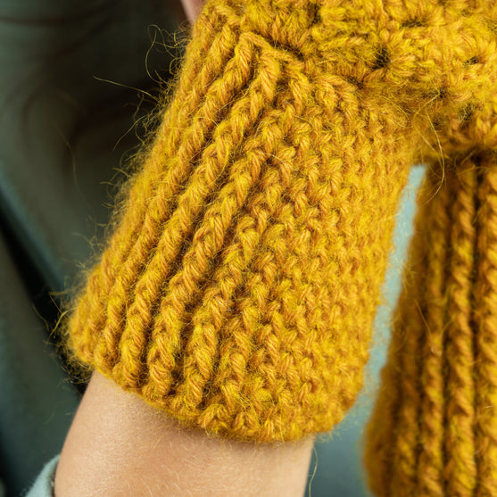 Lavora con 1 capo per ogni filato = 2 capi. Il polso è lavorato in tondo con un motivo all'uncinetto in rilievo. La parte restante è lavorata a righe con un motivo a quadrati e cucita insieme. Una volta terminato dovrai creare il foro per il pollice.