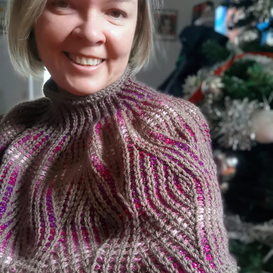 Il poncho è lavorato in tondo, con la tecnica tunisina “a foglia”, in tondo a spirale, usando le maglie e le tecniche base (pt, prt, coste, diminuendo, aumentando). Si lavora dall'alto verso il basso, partendo da un collo a coste, leggermente dolcevita, per poi procedere con aumenti graduali, infine con il motivo sinuoso. Il motivo “a foglia” viene lavorato in multipli di 18 cm e una ripetizione di 22 giri.