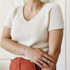La maglietta è lavorata in un unico pezzo dall'alto verso il basso, con aumenti nella raglan. La maglietta ha una vestibilità più ampia da 10 a 15 cm. Il clou della maglietta è il motivo traforato nella parte posteriore, che crea un look romantico e giocoso. Lo scollo a V accentua le curve femminili e completa abilmente il design della maglietta.
