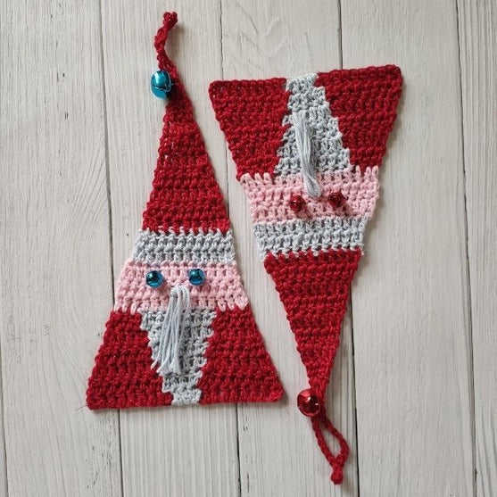 Questa decorazione triangolare è molto semplice da eseguire. L'unica parte complicata risulta essere il corpo di Babbo Natale, composto da tre piccoli elementi trapezoidali uniti tra loro tramite la tecnica join-as-you-go (o JAYG). Questa tecnica, quando utilizzata, è indicata da maglie bassissime scritti in grassetto (mbss) nel modello.