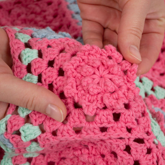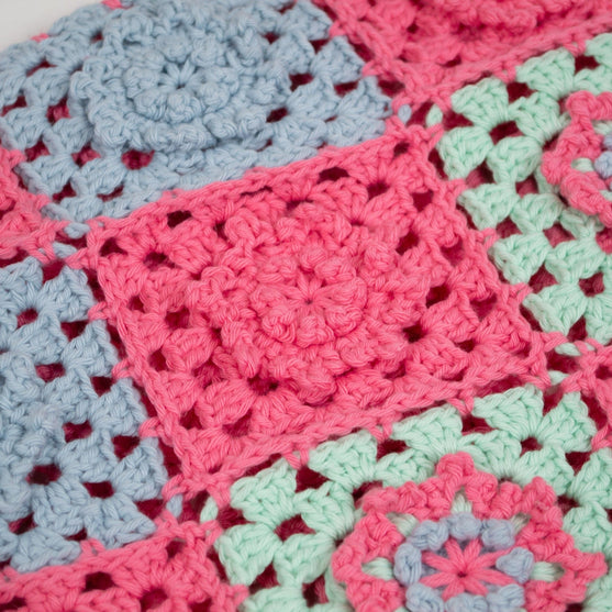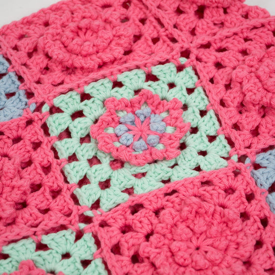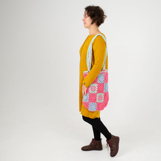 Questa borsa è composta da 30 quadrati in diverse combinazioni di colori, uniti man mano che si procede. Puoi usare la tua fantasia per trovare altri abbinamenti di colori per creare il tuo progetto unico! Se preferisci realizzarlo in tinta unita ti bastano 6 gomitoli.