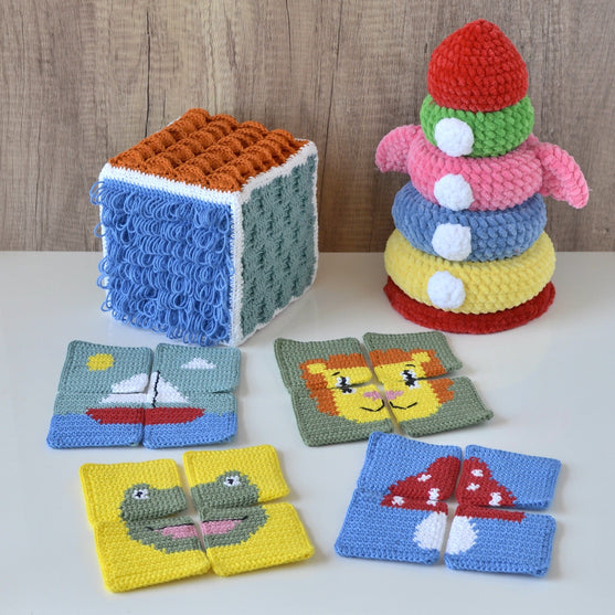 - Ogni faccia del cubo è lavorata con una tecnica speciale all'uncinetto: nell’asola posteriore e anteriore, punto nocciolina, punto waffle, punto basket, maglia alta in rilievo davanti e dietro.