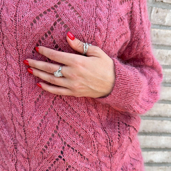 Il maglione Archer è lavorato dall'alto verso il basso, realizzato senza cuciture. La parte posteriore è lavorata avanti indietro, gli aumenti sono eseguiti su entrambe le estremità per formare i bordi delle trecce sulle spalle, poi continua fino al completamento degli scalfi.