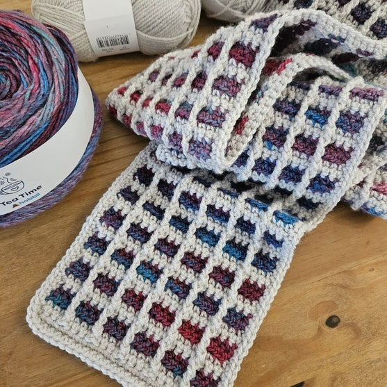 Ecco la sciarpa Neon Grid che è super facile da fare e si lavora così velocemente. La combinazione di filato Amigo XL e Tea Time crea una bella consistenza e la rende così morbida. Sono incluse le taglie, tuttavia, questa sciarpa è facilmente regolabile per realizzare qualsiasi taglia tu voglia, ma tieni presente che il numero di gomitoli di cui hai bisogno cambierà.